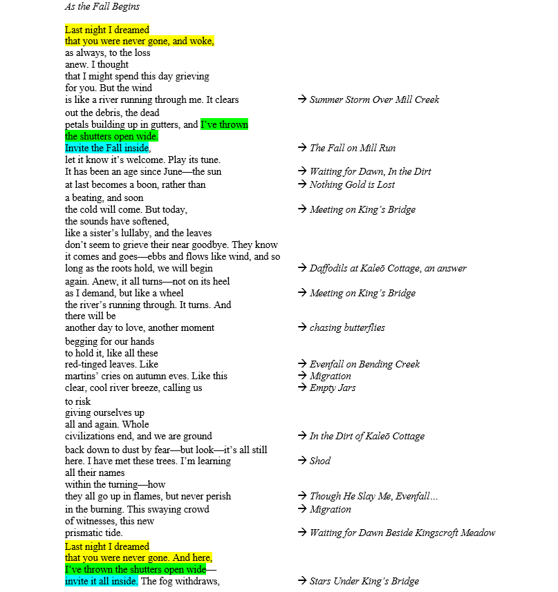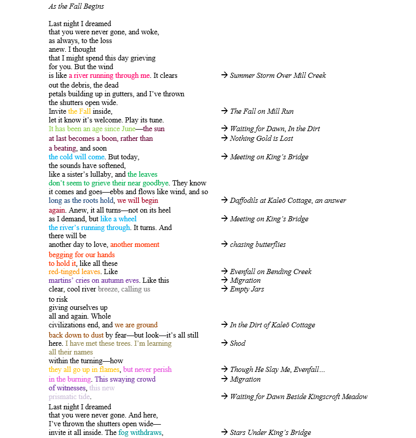 So, “As the Fall Begins” calls the reader back to the rest of the collection, referencing the many poems that have preceded it, carrying them within itself, culminating them, and (hopefully) turning the reader back to experience them again with fresh eyes: