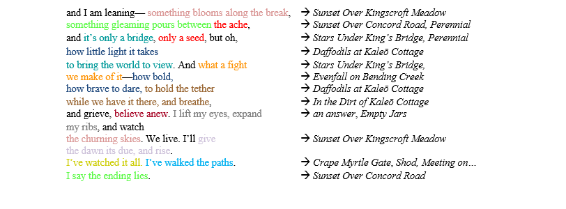It’s only in the second turn, though, that we accept everything that comes in. Even in the space of this small turn, we’ve learned, drawing on our experiences and observations throughout the year to reflect on the moment and come back to it with renewed openness and hope. And when we do that, the fog withdraws—as it did in a moment of reflection on the King’s Bridge—offering clarity that leads to a point that completely re-paints the beginning of the poem, along with (if the reader allows) the rest of the collection.